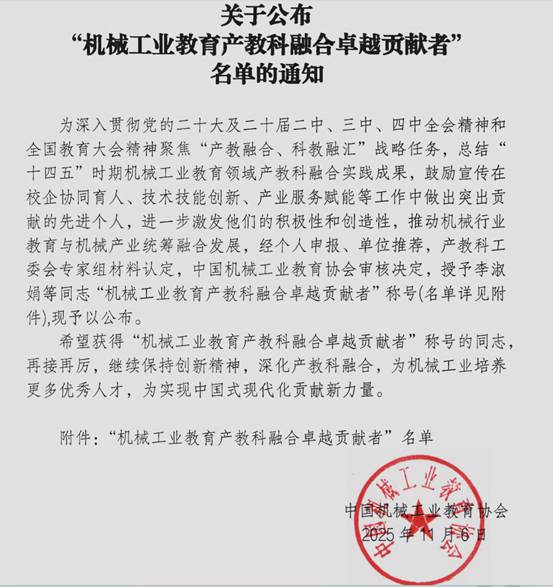 11月7日至10日,中国机械和工业教育协会举办的“产教融合高质量赋能院校建设高水平”专题会议在苏州隆重召开,我校继续教育与综合实训中心教师马立、郭秀明参会,并荣获“机械工业教育产教科融合卓越贡献者”荣誉。