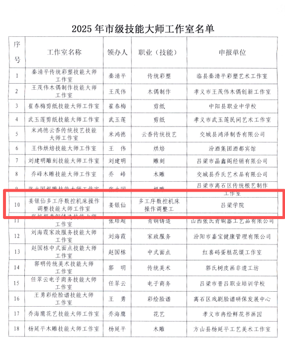 近日,经申报推荐、专家评审、公示审核等规范流程,吕梁市技能大师工作室名单正式公布,我校继续教育与综合实训中心教师姜银仙领衔的工作室成功入选,这标志着中心在高层次技能平台搭建、技艺传承创新及产教融合深化领域实现关键突破。