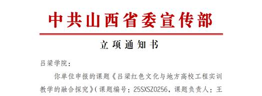 近日,山西省委宣传部公布2025年度思想政治工作课题立项名单。继续教育与综合实训中心教师申报的《吕梁红色文化与地方高校工程实训教学的融合探究》经评审被确定为山西省2025年度思想政治工作课题。